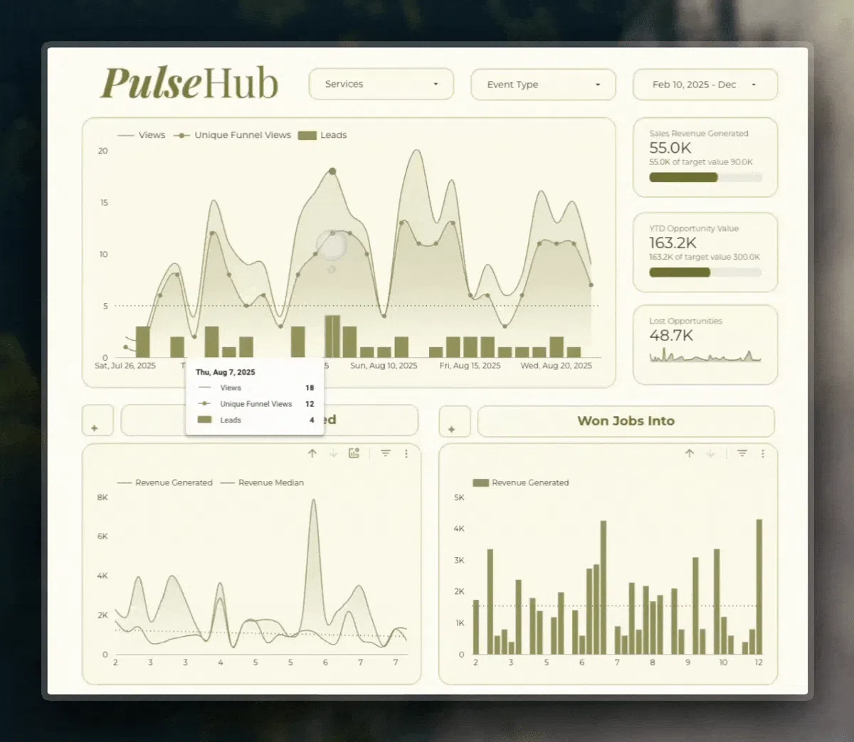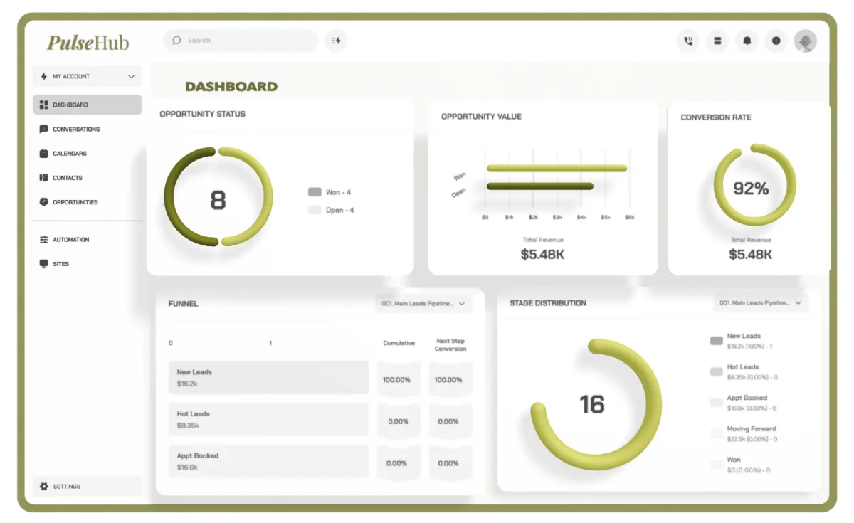 PulseHub replaces your separate CRM, email marketing tool (e.g., MailChimp), calendar booking software (e.g., Calendly), funnel builder, and basic reporting dashboard. It is truly an all-in-one system.